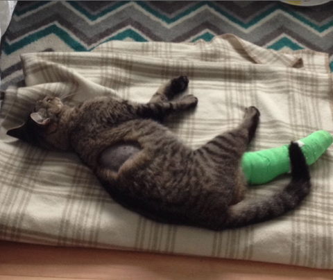 While we are on the subject of animal welfare, I thought I would give an update on Tiger (AKA “Tigie- Baby”), our cat that was shot multiple times by a pellet gun earlier this summer by some low-life scumbag in the neighborhood. Two of the bullets broke his leg. Two other bullets hit his back and chest. We discovered him injured one night while Marshall was cramming to finish his 12-page historical biography on Uncle Al, due the next morning and in need for substantial editing. It was not a good time for a pet emergency.