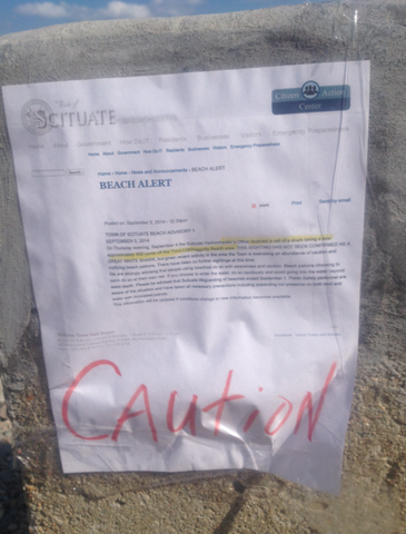 In my hometown of Scituate, we are in the throes of a crisis. A great white shark has possibly been spotted just off of our shores, possibly snacking on a poor helpless seal. Actually, a seal would be more like dinner, not a snack, right? Although for a great white shark, maybe a seal is just a snack. But the point is, we are all in danger. The notice I am forwarding you, spotted at the sea entrances around my neighborhood, proves it. This warning was followed by an article in the Boston Globe, verifying the possible sighting.