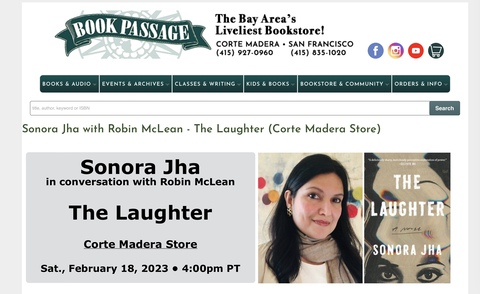 Join me (in person) with Sonora Jha who is launching her wonderful and important novel THE LAUGHTER at Book Passage, in Corte Madera, California, on Feb. 18 @ 4:00pm PST.