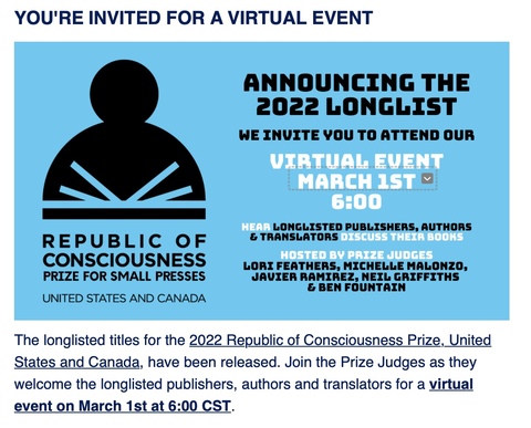 Get'm Young, my new collection of stories, just made the long list for the inaugural 2022 Republic of Consciousness Prize, a very fancy new prize only for small literary presses in the US and Canada. (I'm so thrilled!) The prize been awarding adventuresome small presses (and books) in the UK since 2017, but now they have come to North America.